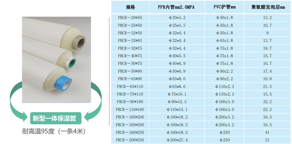 新型PPR保溫管采用聯(lián)塑PPR熱水內(nèi)芯管+聚氨酯發(fā)泡保溫層+PVC(PE)外套保護(hù)層,三層緊密閉合,中間無縫隙、無空氣層,保溫效果極優(yōu)。